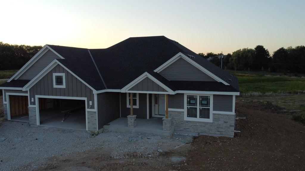 New construction Pinewood ranch expected completion end of year. Vaulted ceiling walking thru front door foyer, kitchen, dinette living room package. Open concept kitchen to living room w/large island w/large area for entertaining. Primary bedroom features trey boxed ceiling detail, private walk in closet, and private bathroom w/ double vanity sinks, walk in shower. Drywall stage of construction is completed. Ceramic tile/finish carpenter coming early October. 8' poured concrete foundation, 50 gallon water heater, high efficiency furnace, central air-low return, roughed in drains for future lower level bathroom w/partial windows on exposure. Exterior shows James Hardie plank cement board siding, partial stone facade, Lift master quiet garage doors and large front porch entrance.