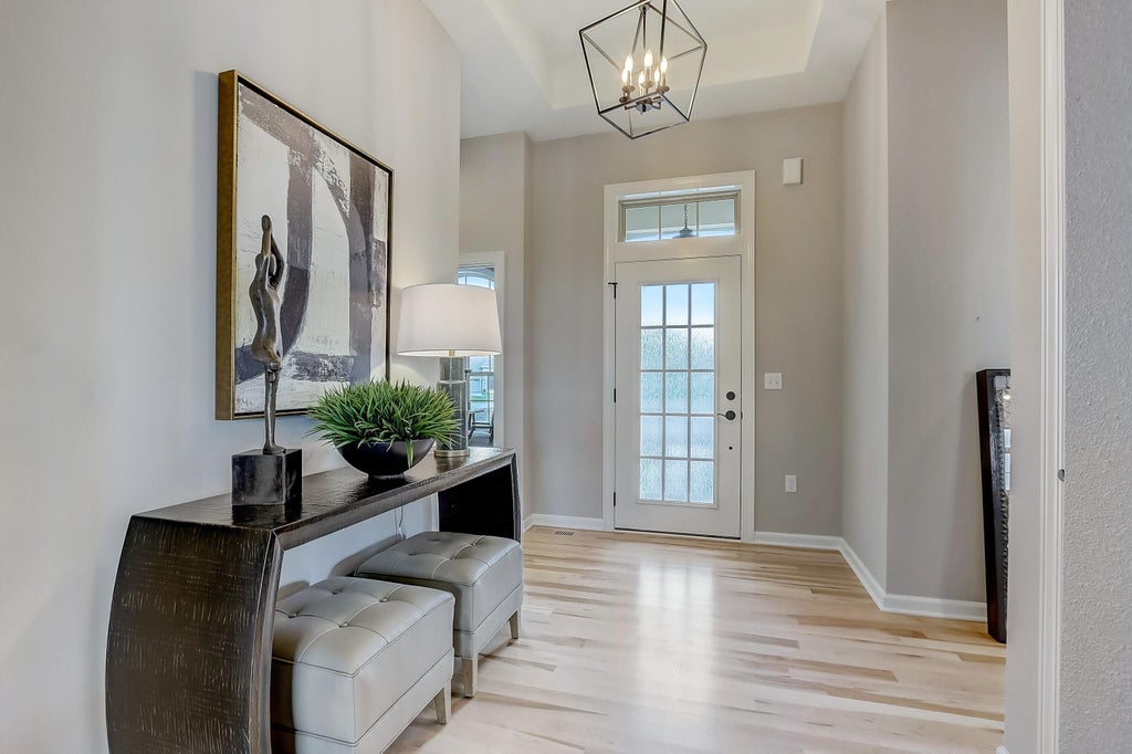 Popular CASTILLIAN floor plan - New Construction - Occupancy approximately December 2025 ~ Planned community in Village Crossing II Condominiums. Luxury finishes are standard. 10' high ceilings, real wood floors, granite kitchen countertops, Corian countertops in baths, kitchen appliances, full basements w/egress window, under-floor rough plumbing for future full bath & wet bar, concrete patio. Includes 1 year membership to YMCA at Pabst Farms; YMCA & grocery store w/in walking distance.