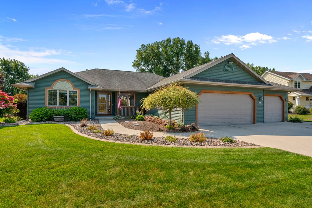 A rare gem in the coveted Hidden Creek neighborhood! 4-bedroom ranch home in the Town of Sheboygan with low taxes set on a .76-acre lot in a cul-de-sac! Split bedroom design + upgrades throughout! 8-year young custom kitchen featuring hardwood floors, pull out/soft close drawers, stainless appliances, gas stove, breakfast bar & Quartz counters! Delightful dining has window walls facing south overlooking mature trees, garden area & a most impressive brick patio! Perfect for ample seating, grilling, and firepit chat. Beautiful berms, spacious greenery + storage shed w/ concrete floor. Custom tiled design entry, vaulted ceilings in great room + tiled fireplace. 1st floor laundry + 3 lockers + 3 car garage with stairs to basement. 5-year young lower-level rec space, wet bar, bedroom & bath!